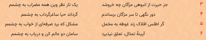 ترکیب های (1,2) و (2,3) و (3,4) رو بررسی کردم. چرا اینجوری شد؟ چون ترتیب بیت ها مهمه! شخمی شخمی که نمیشه انتخاب کرد 🙂 بازم جواب نداد. بعد اومدم ترکیب های سه تایی رو بررسی کردم. دیدم عهه بازم چیزی پیدا نشد. ظاهرا قرار نیست از این شعرا بخاری بلند بشه. دیگه گفتم سگ خور، ترکیب های چهار تایی رو بررسی میکنم که بالاخره پیدا شد! خوشحال نشید! فقط دو تا ترکیب چهار تایی پیدا شد. یکیش کار داداشم بیدل دهلوی بود، اون یکی هم کار صائب تبریزی!غزل شمارهٔ ۲۲۵۳ بیدل دهلوی :https://ganjoor.net/bidel/ghazalbi/sh2253