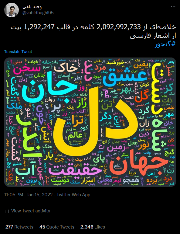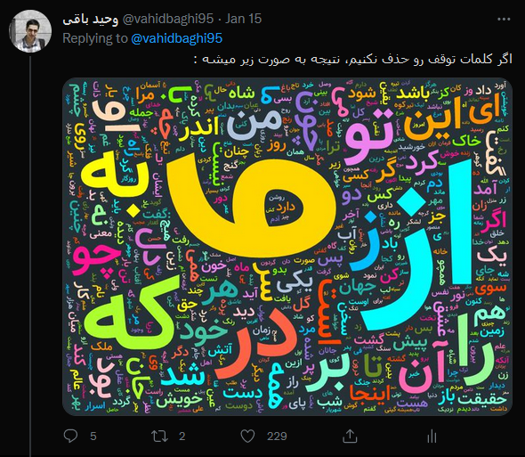 اما همونطور که گفتم، نمیتونیم یک لیست از کلمات توقف رو برای همه پروژه ها استفاده کنیم. باید متناسب با هر پروژه، یک لیست جدید ایجاد کنیم. مثلا این لیست کلمه «مِی» رو به عنوان کلمه توقف در نظر گرفته و یکی از پایه های شعر فارسی رو حذف کرده! موقعی که داشتم توییت رو مینوشتم خیلی فرصت این رو نداشتم که کلمات توقف رو تغییر بدم و باعث شد چند تا از کلمه های مهم از ابر کلمات حذف بشه! اما الان یه مقدار بیشتر وقت گذاشتم و کمی این لیست رو تغییر دادم تا نتیجه دقیق تری داشته باشیم.بر اساس اطلاعاتی که در سایت گنجور نوشته شده است، این دیتابیس شامل ۱,۲۹۲,۲۴۷ بیت شعر است. همچنین تعداد کلمات منحصر به فرد در گنجور ۴۴۶,۵۶۹ عدد است که در لینک زیر قرار دادم :
