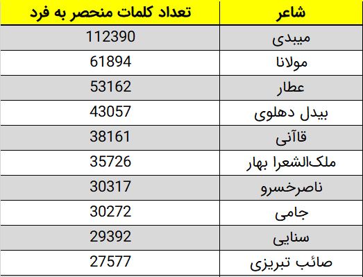 حالا میخوام بررسی کنم در دایره واژگان هر شاعر چه تعداد کلمات منحصر به فرد وجود داره که سایر شعرا از اون استفاده نکردند. لیست ۱۰ نفری که بیشترین کلمه منحصر به فرد رو دارند، در جدول زیر قرار دادم :