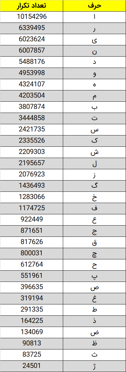 جدول زیر، تعداد تکرار هر یک از حروف الفبا در تمام اشعار گنجور را نشان میدهد :