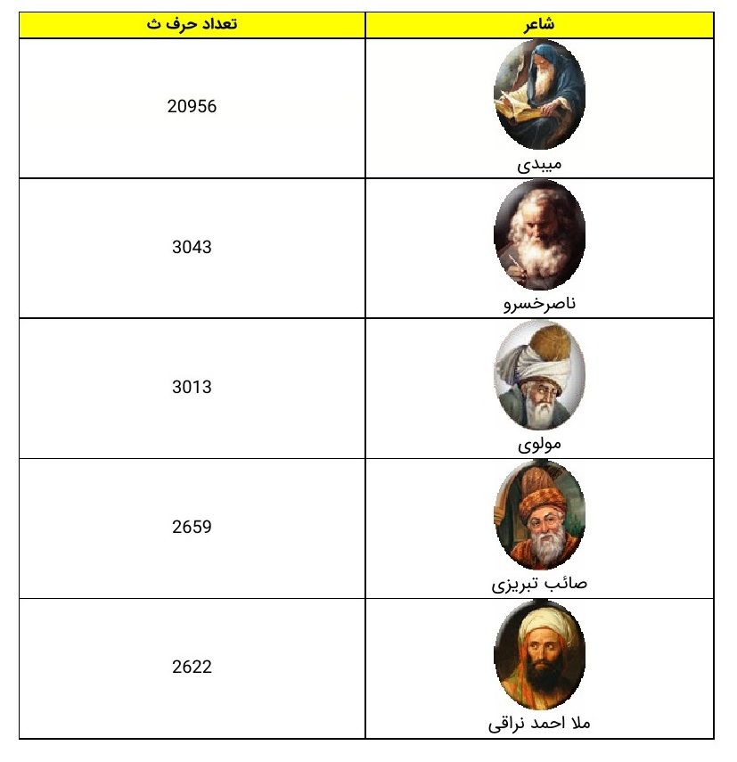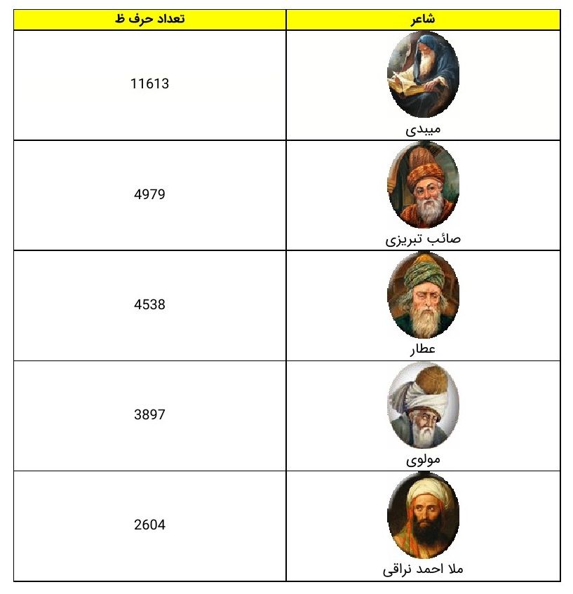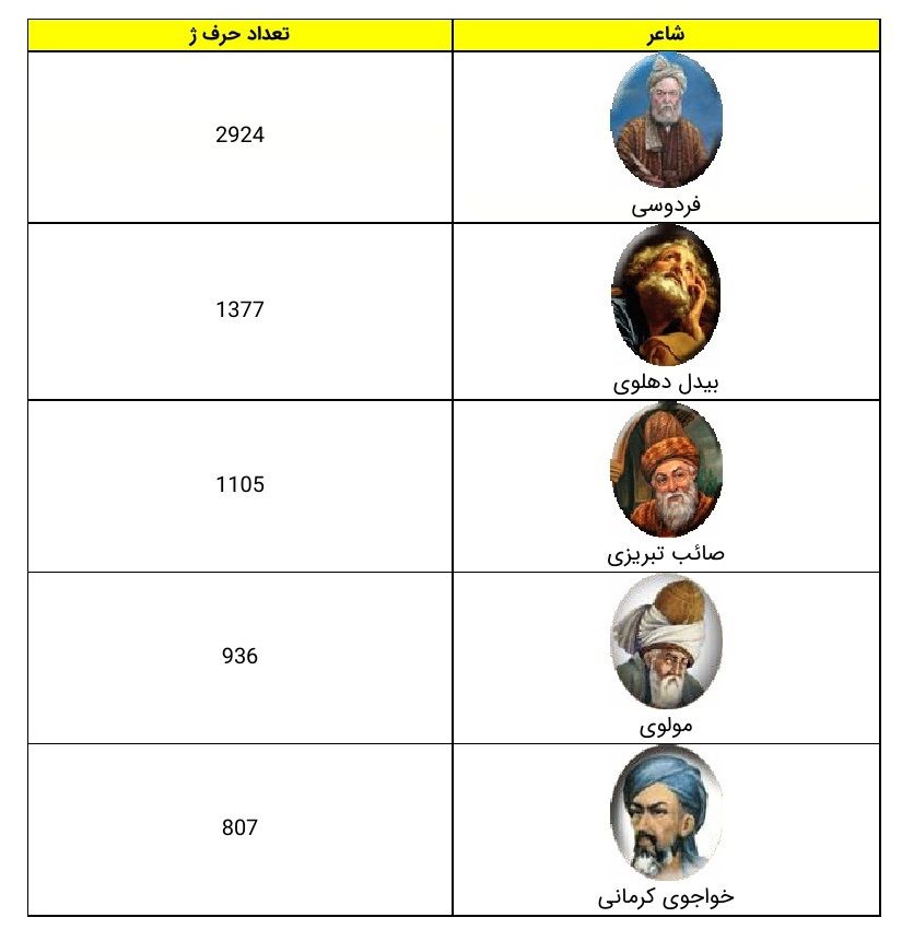 از جدول بالا میشه فهمید که حروف ژ ، ث و ظ کمتر از سایر حروف در اشعار فارسی تکرار شدهاند. حالا میخوام بررسی کنم که کدام یک از شعرا بیشتر از سایرین از این حروف در اشعار خود استفاده کردهاند؟