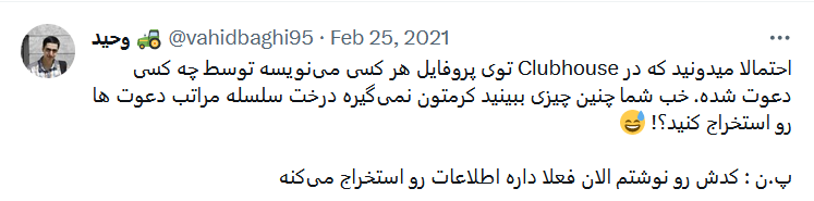 وقتی وارد کلاب هاوس میشدی، توی پروفایل هر شخص نوشته بود که توسط چه کسی دعوت شده. اگر همینجوری جلو میرفتی، میتونستی سرشاخه رو پیدا کنی. خب این خیلی برای من هیجان انگیز بود. من ۷ اسفند ۱۳۹۹ یه توییت هم در موردش نوشتم :