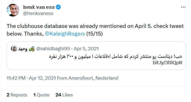 تا اینجا کسی (به جز فالوور های توییترم) نمیدونست کار من بوده. تا اینکه این شخص که یک متخصص OSINT هلندی بود توییت من رو پیدا کرد :